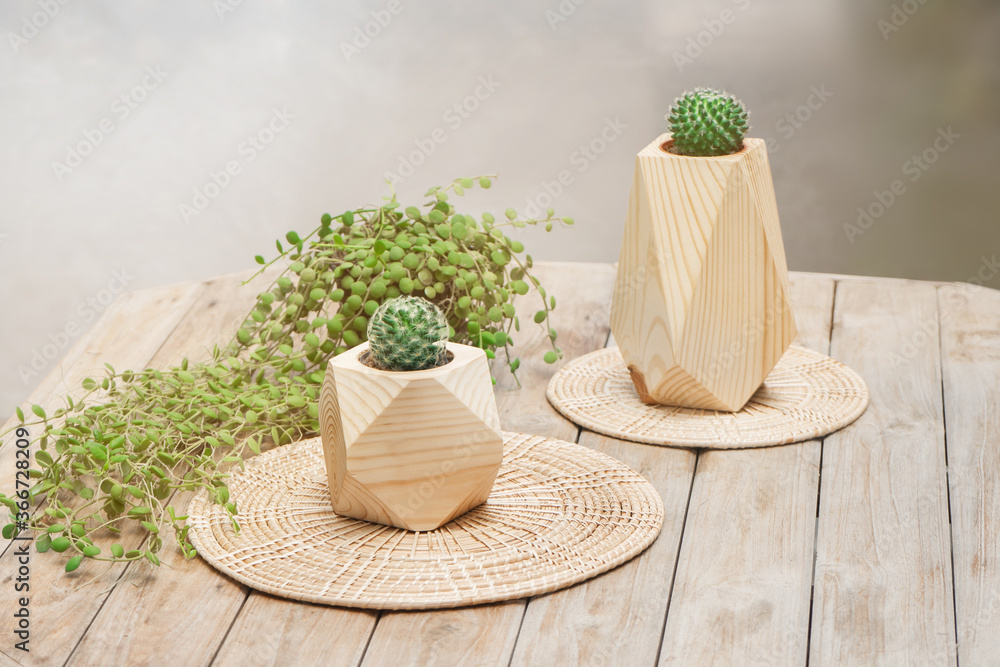 Cactus plan in wood pot put on wooden table and succulent plant, gardening concept