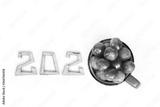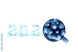 berries of ripe sweet cherries in a red cup on a table with number top view. delicious summer 2020