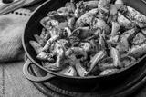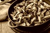 Homemade fried potato with herbs and mushrooms in frying pan on table with napkin, close up