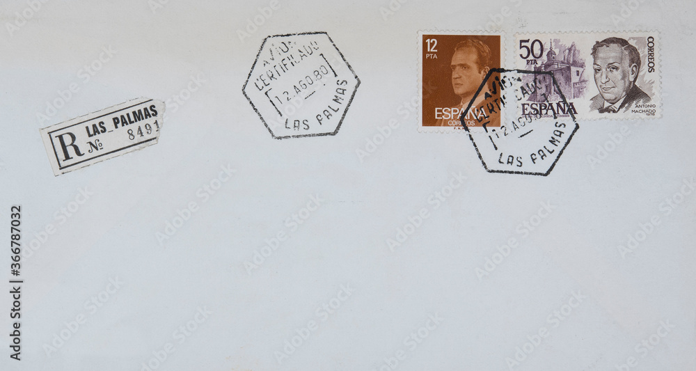 Brief letter mail Briefmarke stamp vintage retro alt old Spanien Spain Mallorca Umschlag envelope Las Palmas registered Einschreiben Mann person man schloss espana antonio machado correos
