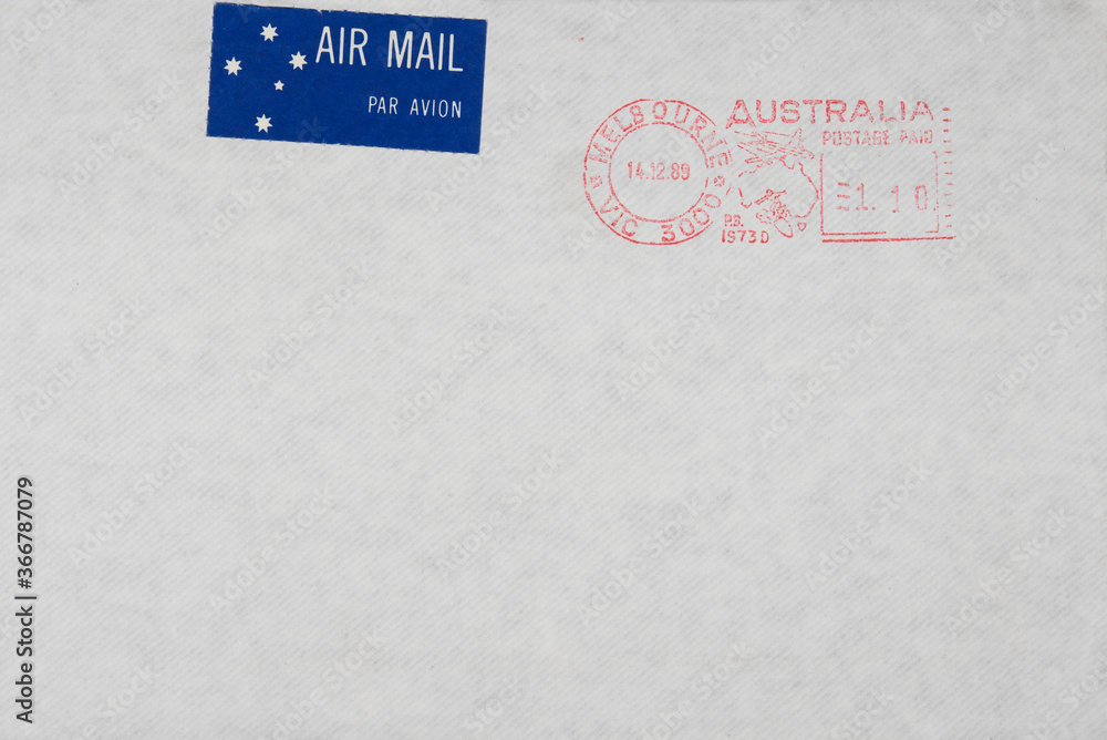 Luftpost air mail vintage retro Umschlag envelope Australien Australia gestempelt used Melbourne Flugzeug Surfer plane postage red rot