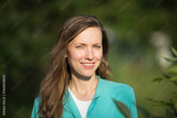 portrait of a young woman with long hair, natural woman outdoor portrait over green grass park background