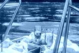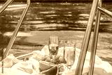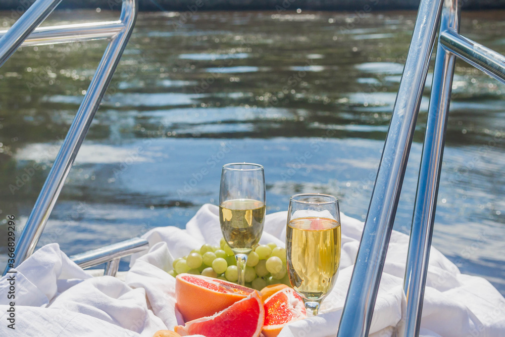 Juicy bright fruits grapefruit, grapes, apricot, two glasses of wine are on the boat by the river, the sea.