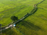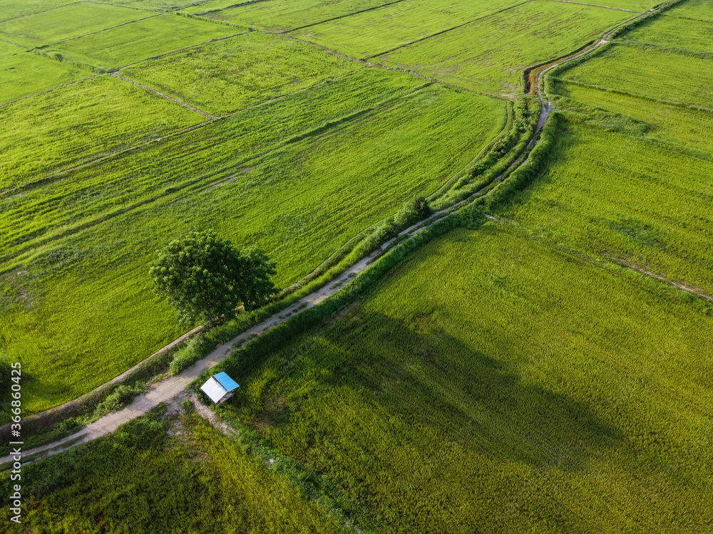 Aerial photograph, Green rice fields in rural areas, Thailand