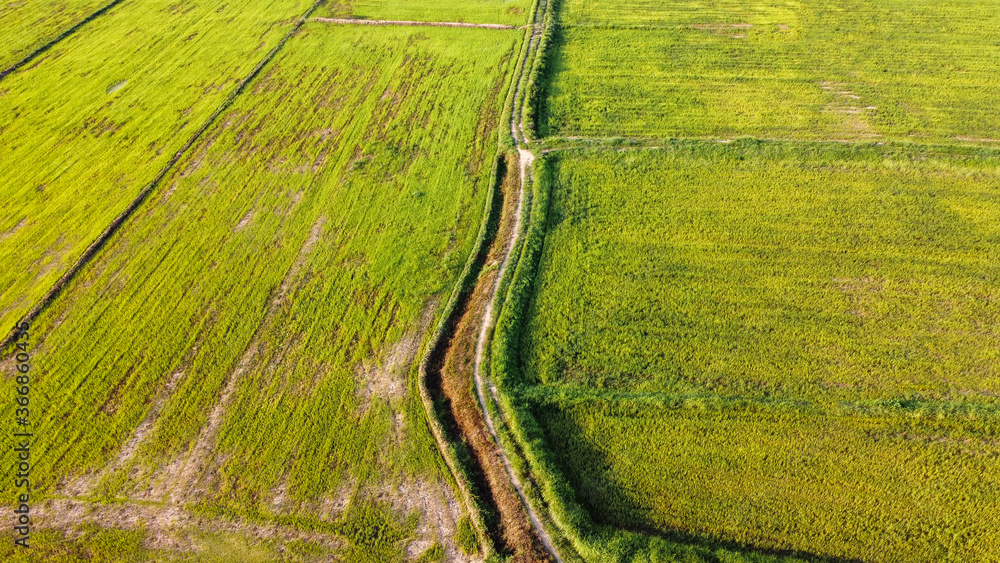 Aerial photograph, Green rice fields in rural areas, Thailand