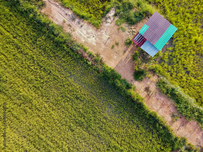 Aerial photograph, A hut in the green rice fields in the countryside, Thailand