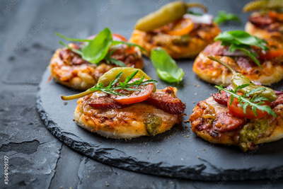 Homemade small pizza with pesto, salami, tomatoes and arugula