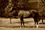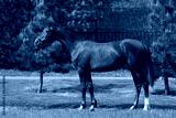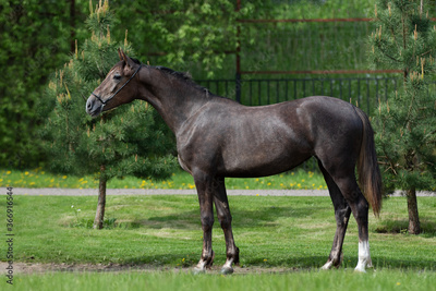 Dark gray horse stands on natural summer background, profile side view, exterior