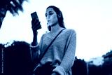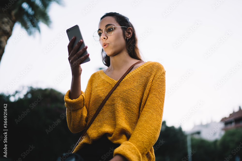 Expressive caucasian hipster girl in casual wear and spectacles amazed with great news from social networks using mobile phone, emotional woman watching wow video on smartphone outdoors