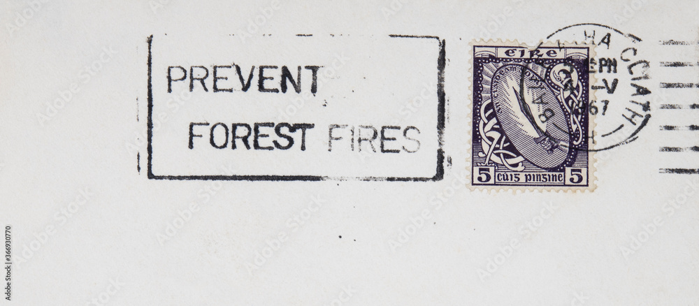 Irland Ireland vintage retro Briefmarke stamp slogan Werbung prevent forest fires dublin schwert sword