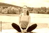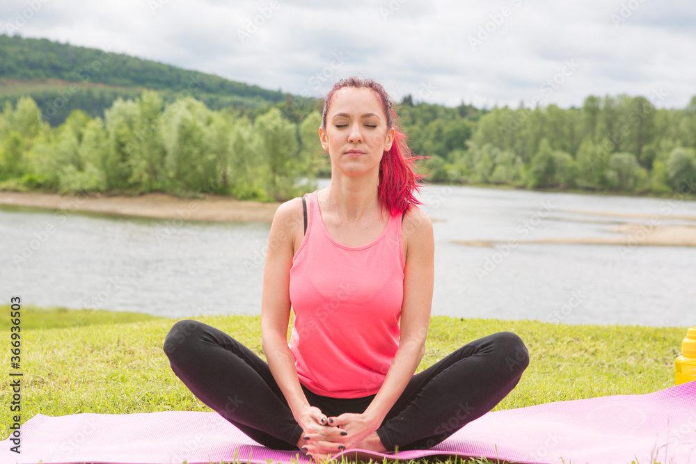 The girl on the nature in a park is engaged in yoga. Healthy lifestyle.