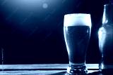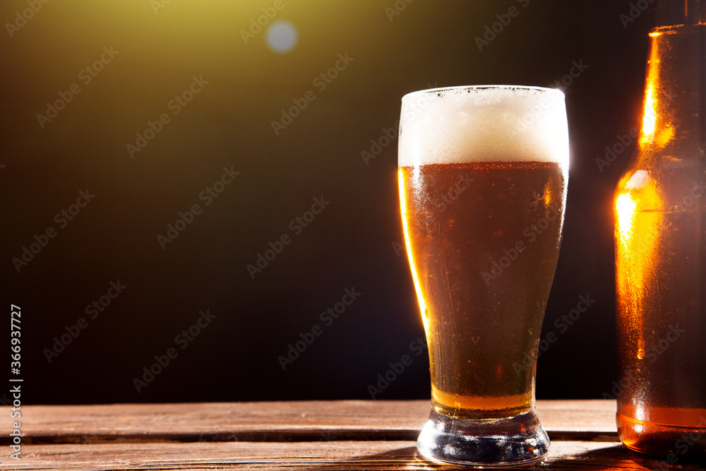 Cold tasty beer on hot summer day. Bottle and glass of beer on a wooden table against black background and copy space