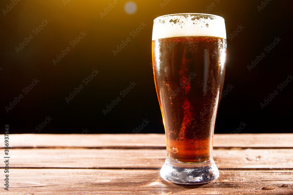 Cold tasty beer on hot summer day. Glass of beer on wooden table on black background