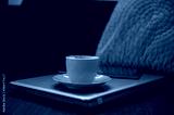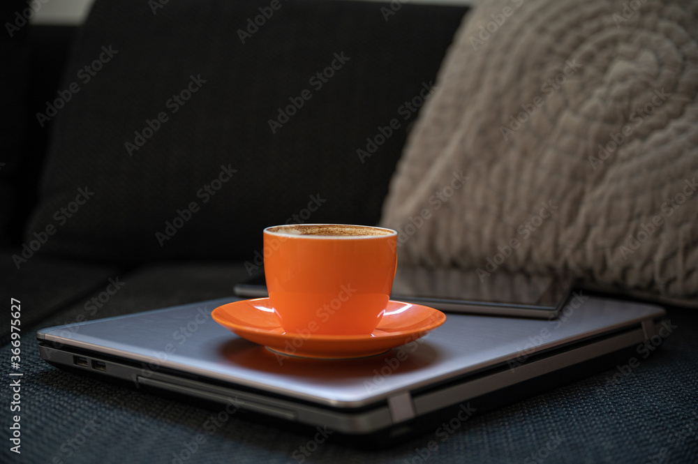 Orange cup of coffe and digital tablet placed on laptop computer sitting on a couch