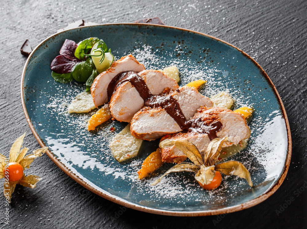 Turkey meat steak with caramelized fruit and chocolate chili sauce in plate on dark stone background. Hot Meat Dishes
