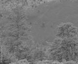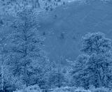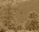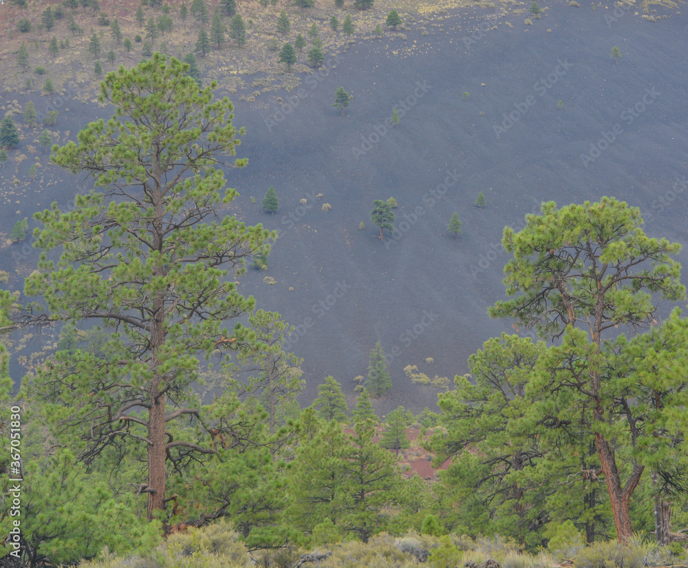 Ponderosa Pine Trees with Tephra Volcanic ash on the mountain slopes in the background. Flagstaff, Arizona