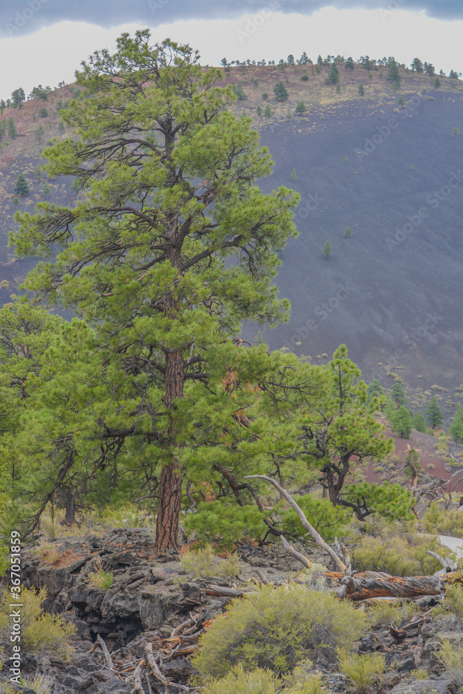 Ponderosa Pine Trees with Tephra Volcanic ash on the mountain slopes in the background. Flagstaff, Arizona