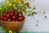 Red ripe cherries with stem in bowl.