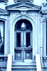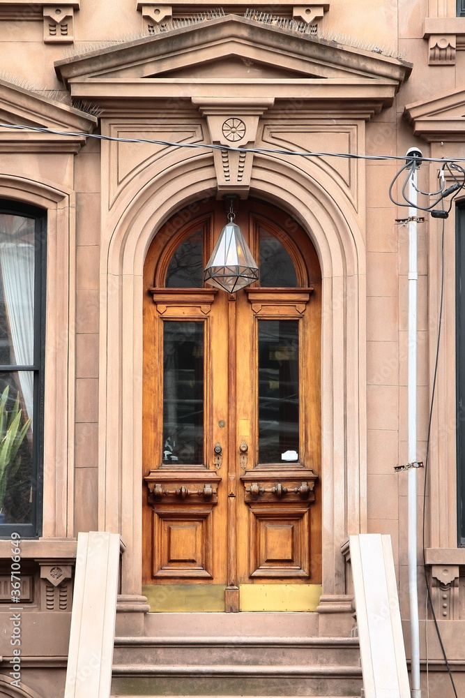Double wooden vintage arched entry door decorated with keystone, triangular fronton and moldings. New York. USA.