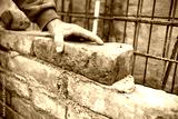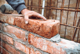 Construction mason, worker laying bricks and building walls on construction site. Detail of hand adjusting and placing bricks