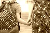 mom accompanies son to school. she encourages student to accompany him to school