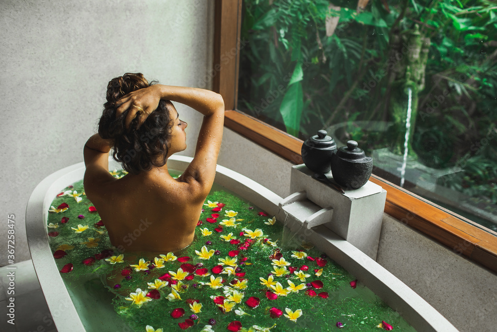 Beautiful young woman enjoying in spa, view from behind. Luxury stone bath tub with jungle view in window. Tropical flowers in water. Beauty treatment concept.