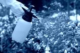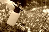 Female hand holding garden spray bottle with pesticides and spraying liquid on blooming roses. Control insects and plant diseases.