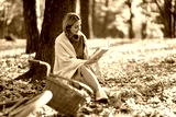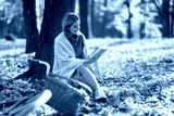 Beautiful young woman sitting on a fallen autumn leaves in a park, reading a book. Smiling girl with a bicycle enjoying rest and freedom. Relaxation and lifestyle concept.