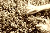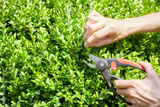 Hands with scissors trimming home garden boxwood hedge.