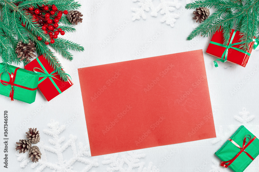 Empty red wishlist for Santa Claus. Gift, postcard, pine cones, fir branches on white textured table. Christmas, winter, new year concept.