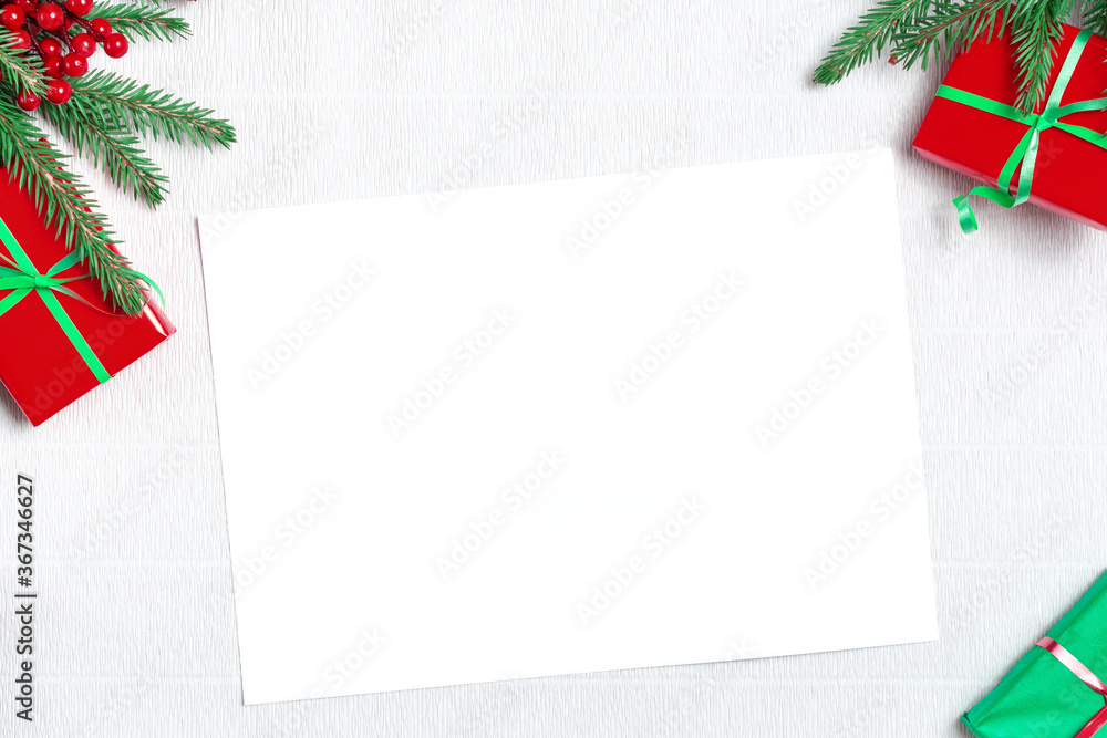 Christmas empty blank letter to Santa. Christmas mockup. Christmas decor, pine cones, fir branches on white background. Flat lay, top view.