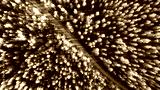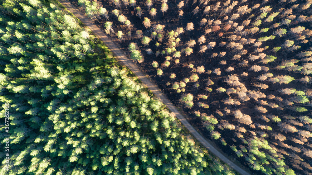 Aerial view of dead trees after fire. Pine forest with a road. The road separates the burnt forest from the green forest.