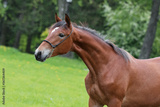 Portrait of a beautiful chestnut horse with mane stands on natural summer background, head closeup