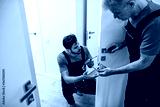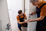 Two locksmith, repairmen, workers in uniform installing, working with house door lock using screwdriver. Repair, door lock service concept