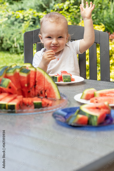 Smiling baby boy is eating watermelon waving his hand at the camera. Vertically.