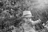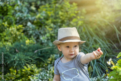 Cute little baby boy with a hat on his head is showing strawberry in the garden.