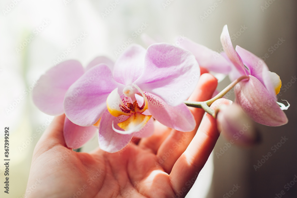 Purple orchid phalaenopsis. Woman taking care of home plants. Close-up of female hands holding violet flowers