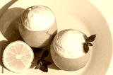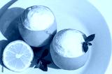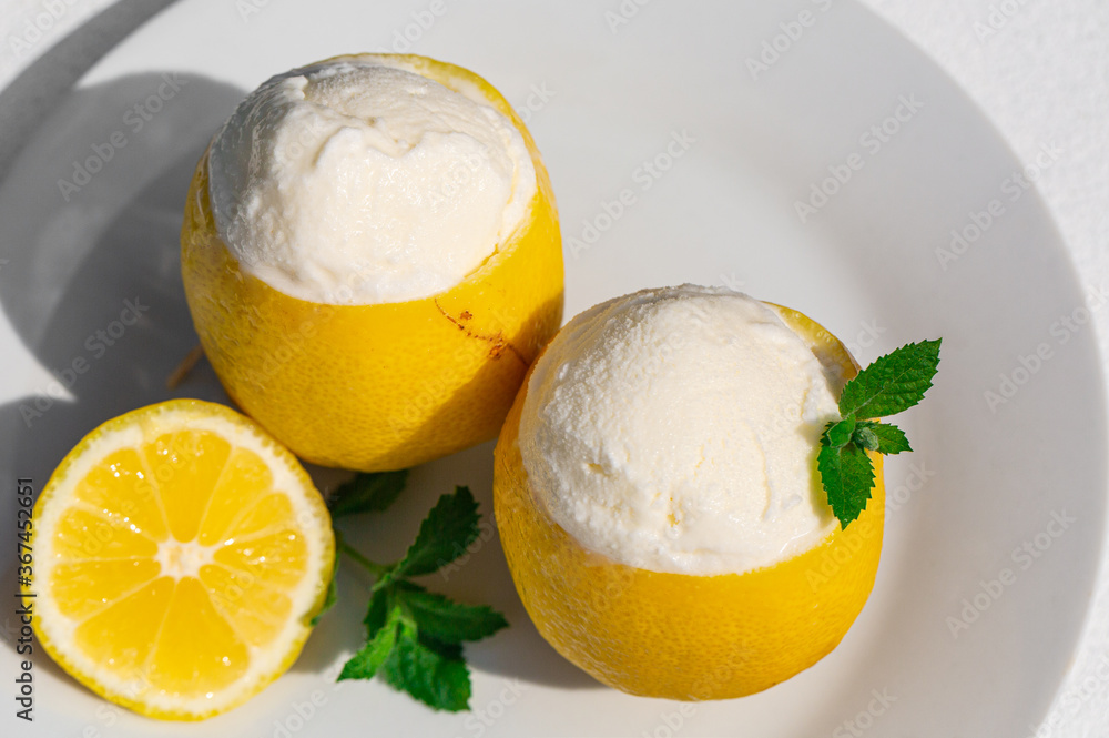 Homemade italian Sorbetto al limone or Lemon sorbet. Decorated with mint. Top view. From above. Hard light.