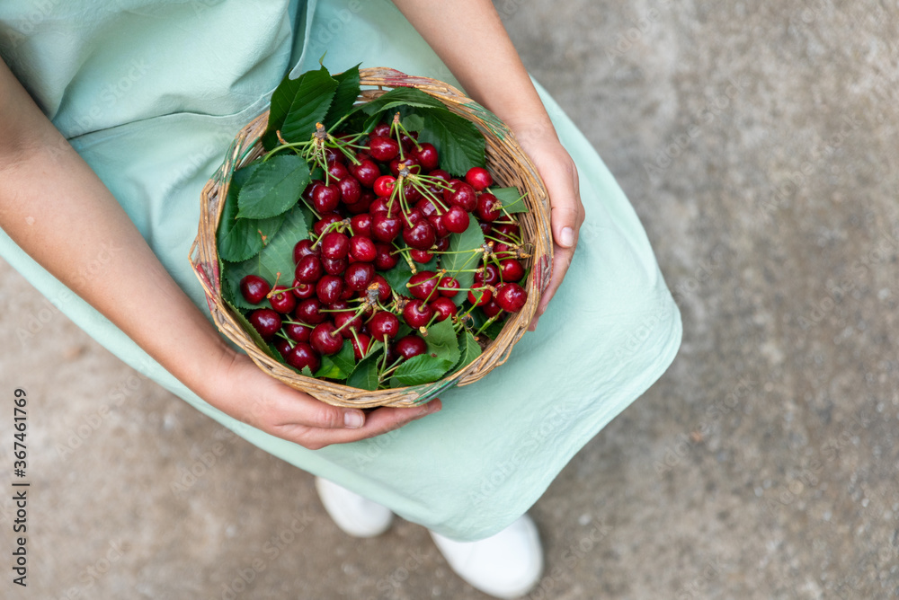 Young woman hold a basket with cheries.