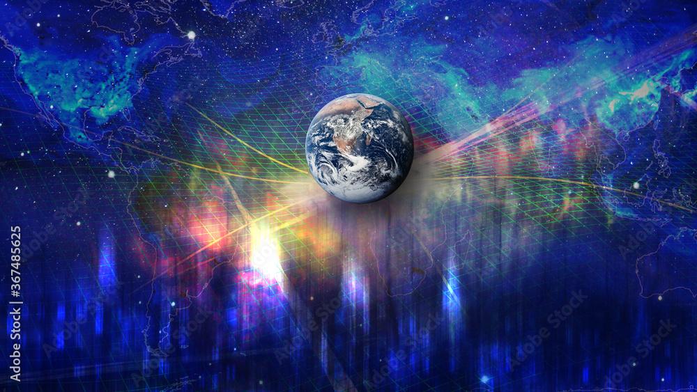 Planet Earth on the background of blurred lights of the city and world map. Concept on business, politics, ecology and media. Earth day abstract background. Elements of this image furnished by NASA.