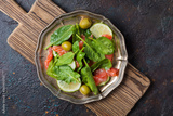 Tasty green salad with salmon, fresh spinach, olives, lime and cucumbers