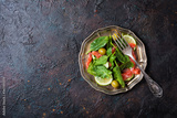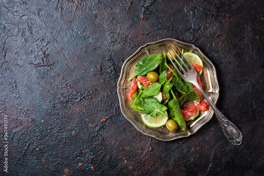 Tasty green salad with salmon, fresh spinach, olives, lime and cucumbers