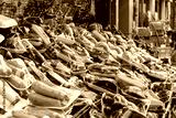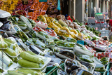Group of fresh vegetables and fruits packed with stretch film for coronavirus measures on street counter of groceries. Results with plastic pollution. Istanbul, Turkey.