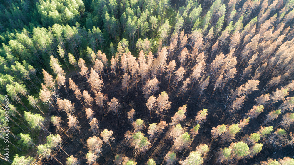 An aerial view of burnt trees and forest area after a forest fire