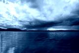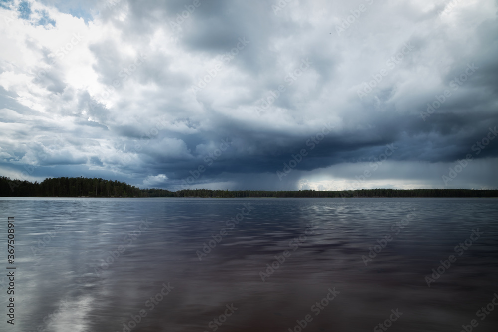Rain clouds on the horizon over a lake and forest. Dark lake before storm.