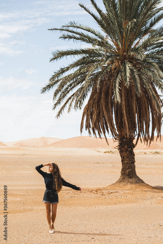 Woman walking in beautiful desert with sand dunes and one lonely palm. Travel in Morocco, Sahara, Merzouga. Freedom and travel concept.