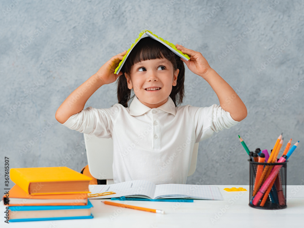 Back to school. Cute child schoolgirl sitting at a Desk in a room. The child learns and does homework.