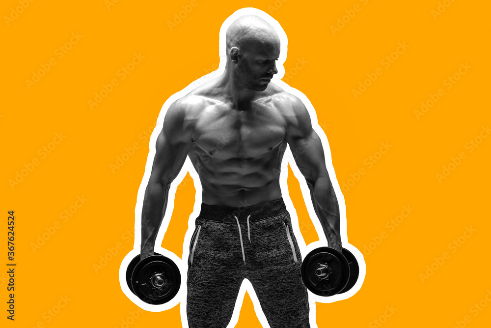 Young fitness man with a template for printing with copy space. Isolated trendy orange background