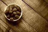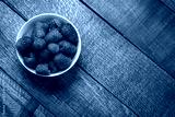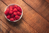 Close up top down overhead shot of a white bowl of raspberries on a weathered, rustic, brown wooden table