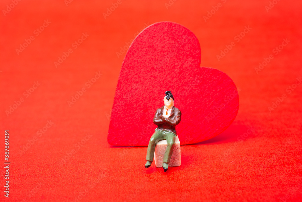Man figurine sitting berfore Heart shape. Valentine love concept